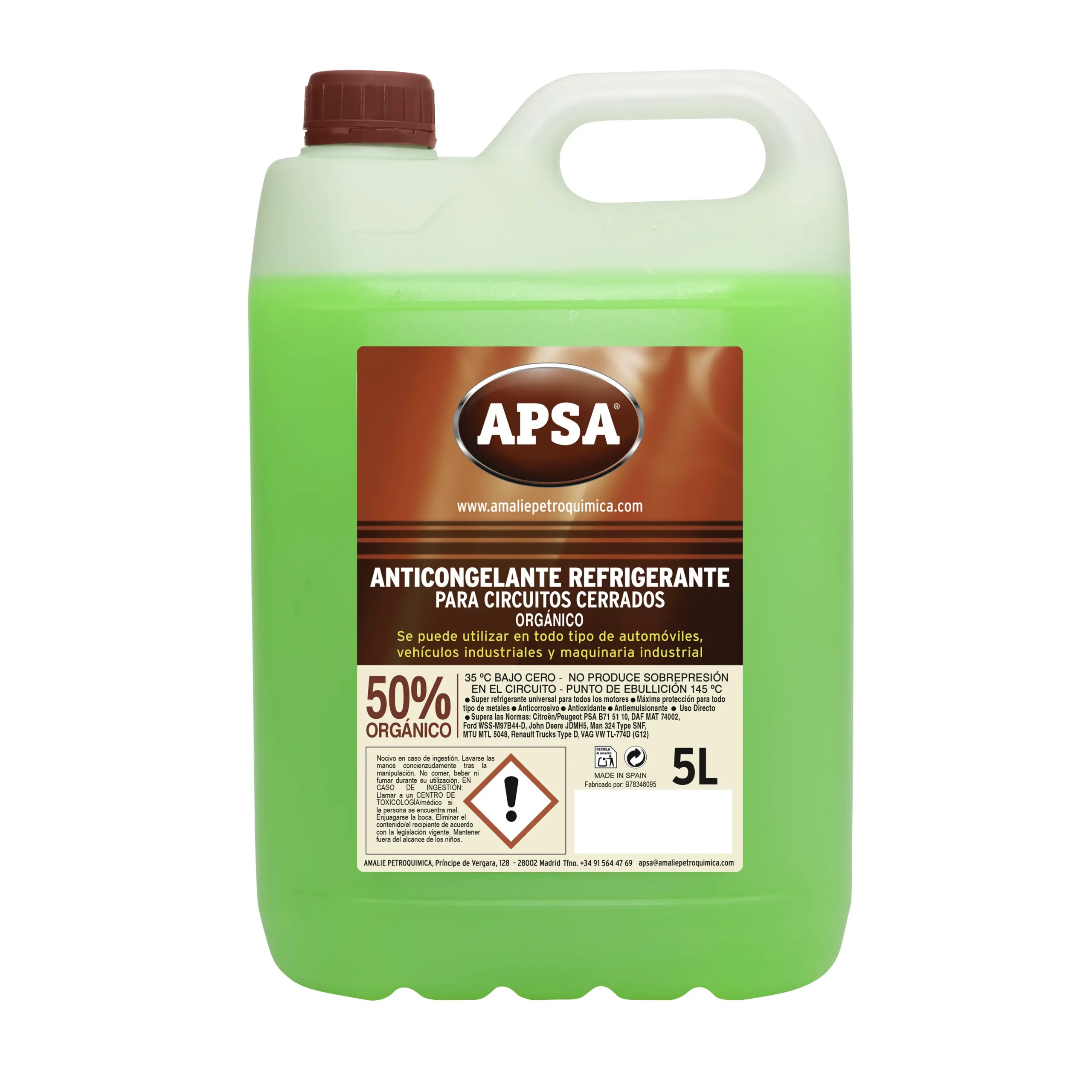 Líquido especial para circuitos de refrigeración del motor de uso directo en circuitos cerrados en vehículos ligeros, vehículos pesados, maquinaria de obra pública y agrícola y motores estacionarios.